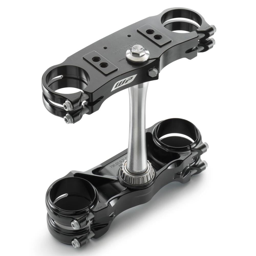 One sure way to look factory is with a set of orange anodized CNC milled aluminium triple clamps. Not only do they look great, but they were designed by KTM R&D and WP to provide the very best interaction between the KTM steel frame and WP fork legs. With ideal flexibility and steering stem stiffness, they deliver enhanced handling and front wheel stability. Two simple offset adjustments allow handling and turning characteristics to be further refined.