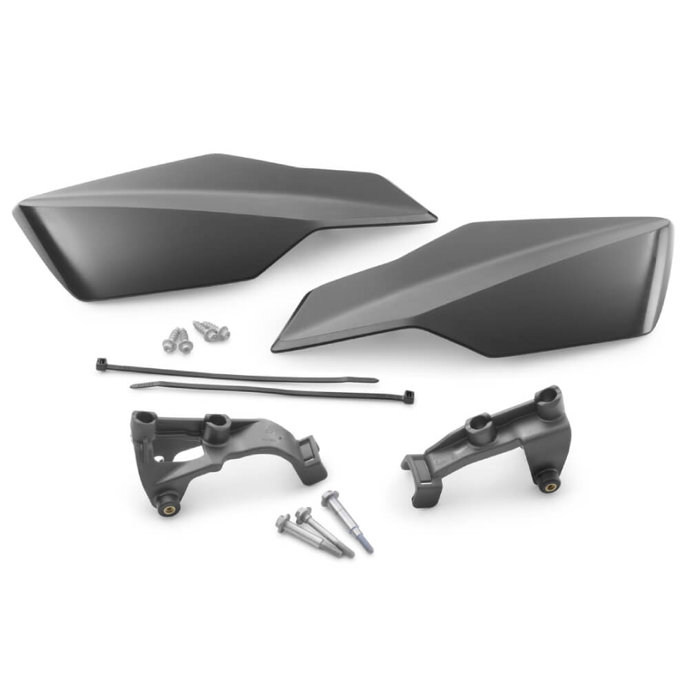 The KTM A49002979000C1 Handguard Kit in Black offers a racing aesthetic with an open design. This package is lightweight and attaches directly to the levers with specialized mounting hardware. This kit has been specifically crafted for integration with a Brembo brake system.