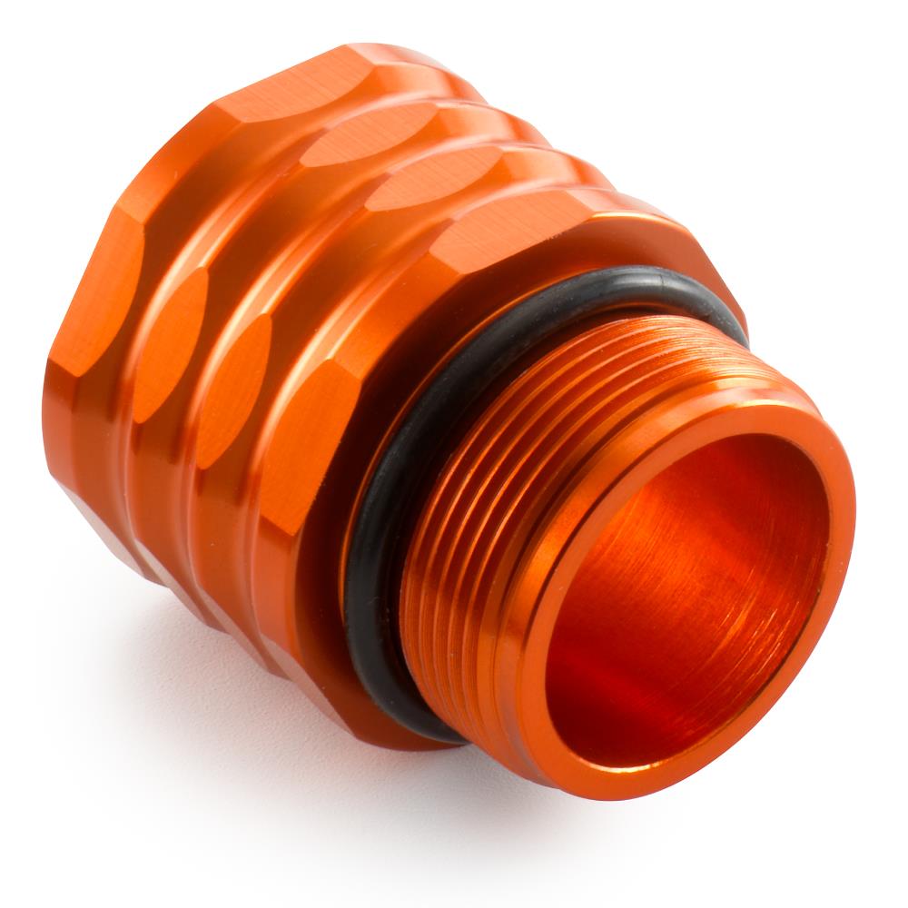 The KTM Master Cylinder Extender 79013961000 is designed to enhance the performance of your KTM motorcycle's rear master cylinder. By increasing the volume of the rear master cylinder, this extender ensures improved braking efficiency, resulting in a more responsive and reliable braking system. The extender also features additional cooling ribs that effectively minimize the heating of the brake fluid, preventing overheating and maintaining optimal brake performance even under demanding riding conditions. This innovative design eliminates "fading" almost completely, ensuring consistent and reliable braking performance throughout your ride. With a total height including cover of approximately 26.5mm, the extender seamlessly integrates with the existing components of your motorcycle, providing a sleek and functional upgrade.