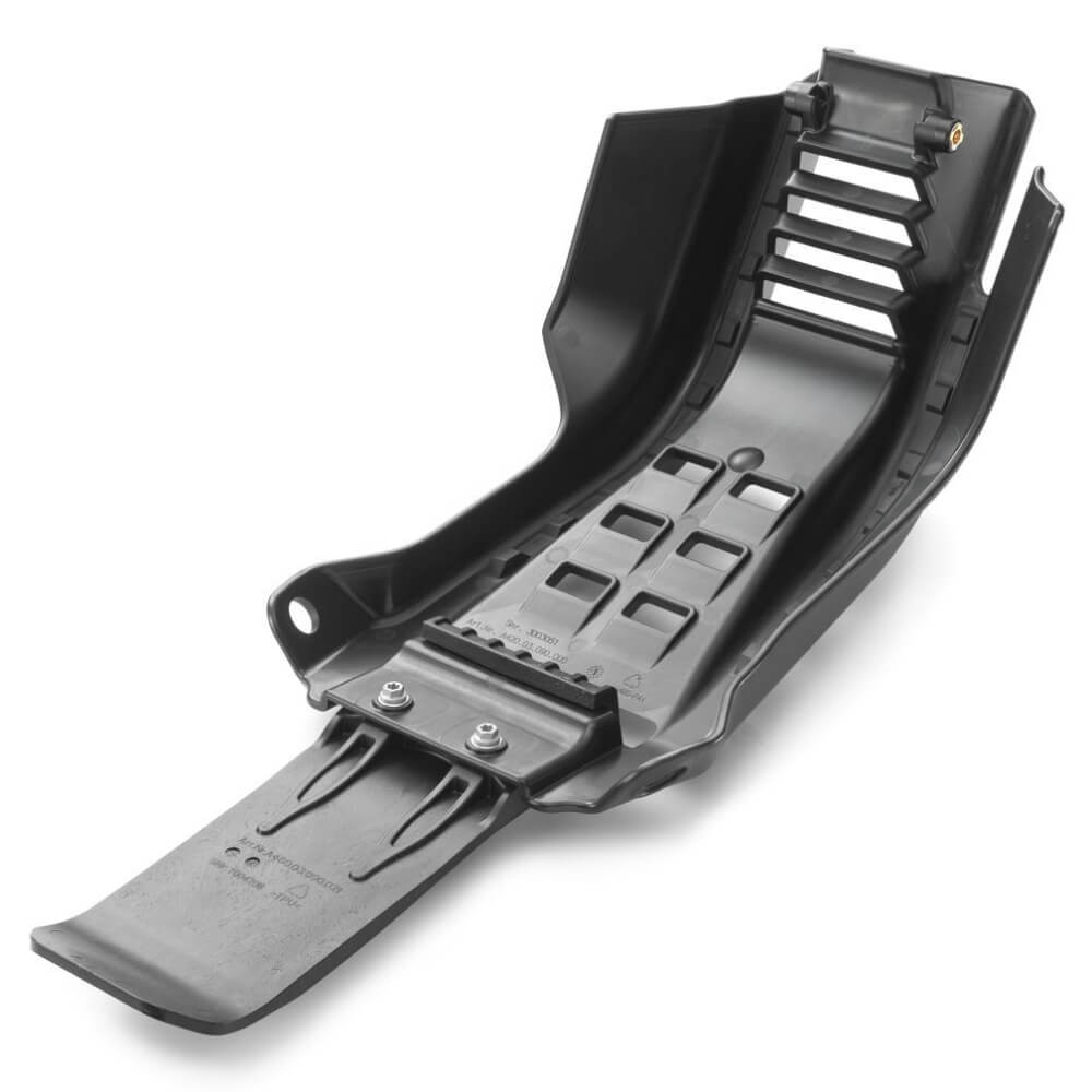 The KTM Skid Plate A46003090544 provides maximum coverage for the frame and engine. Quick to install, it guards the linkage against damage and is built with superior construction for a lightweight yet durable design. Tested in extreme off-road environments, this piece has proven its strength.