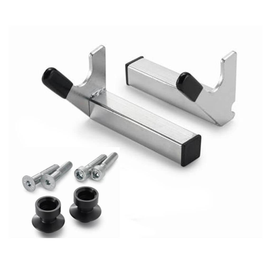 This KTM V Paddock Stand Adapter and Bobbin Kit 61029955244 is the ideal tool for lifting your motorcycle at the rear axle. Securely clamped into the rear wheel paddock stand, the set includes an adapter and bushing kit for a predefined breaking point for your bike. Enjoy a safe and reliable stand for your bike with this KTM V Paddock Stand Adapter and Bobbin Kit.