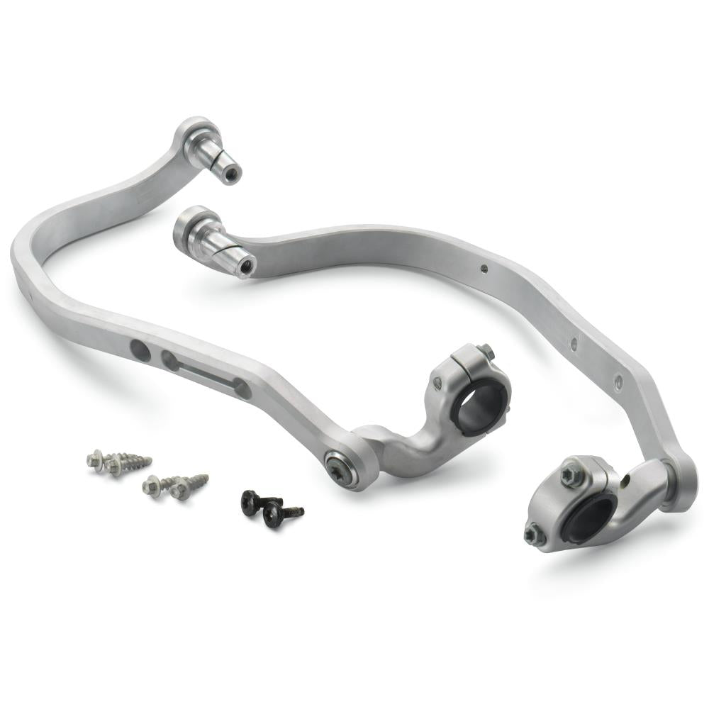 The KTM Wrap-Around Handguard Kit 79702984044 offers extreme durability, thanks to its aluminium brackets. It is designed to safeguard against broken levers and comes complete with all necessary assembly components.